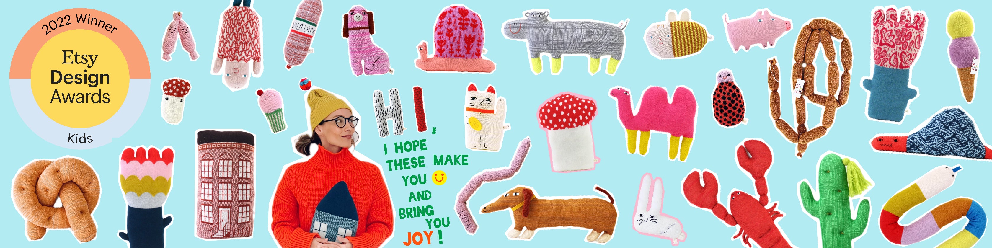 All knitted friends are designed and handmade by me in my home-based studio in the US. Knitwear and blankets are dreamed up by me and crafted with care by a knitwear manufacturer.