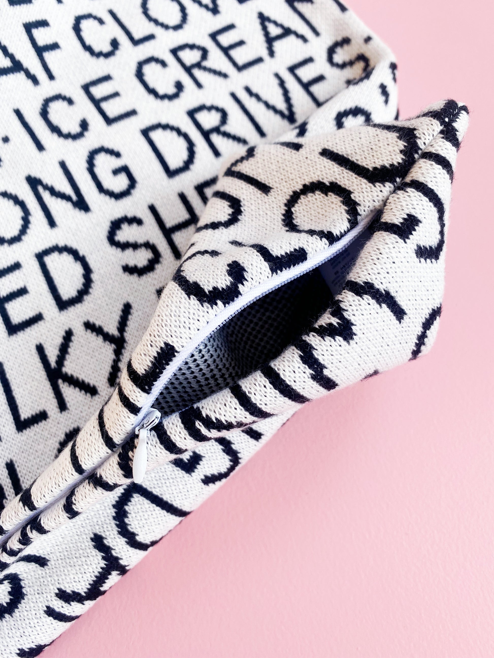 Wordy Pillow - a cozy knit cover sprinkled with all your favorite things, from 'books' to 'warm hugs' and everything in between, this pillow is a playful reminder of life’s sweetest moments. It's like a soft, snuggly word search that celebrates the little joys of life! Almost everyone will be able to find "their" favorite thing in the pattern of these words. Crafted with a premium cotton/poly blend, it's always soft and never scratchy - perfect for cuddles, naps, or simply admiring its clever design. Plus, it's easy to care for, so you can enjoy it for years to come.