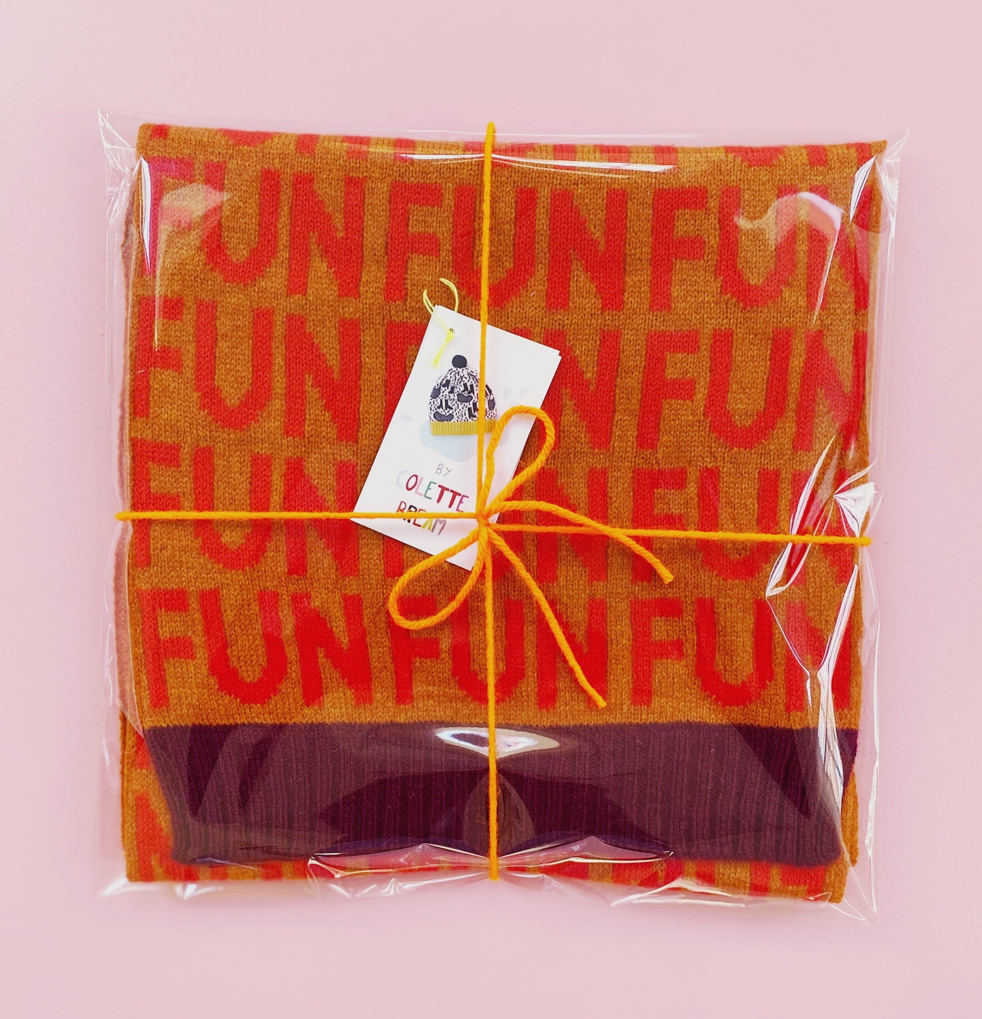 Knitted from 100% Lambswool, this scarf features a playful and unique 'Fun' pattern that’s sure to spread cheer and bring a smile to your face.