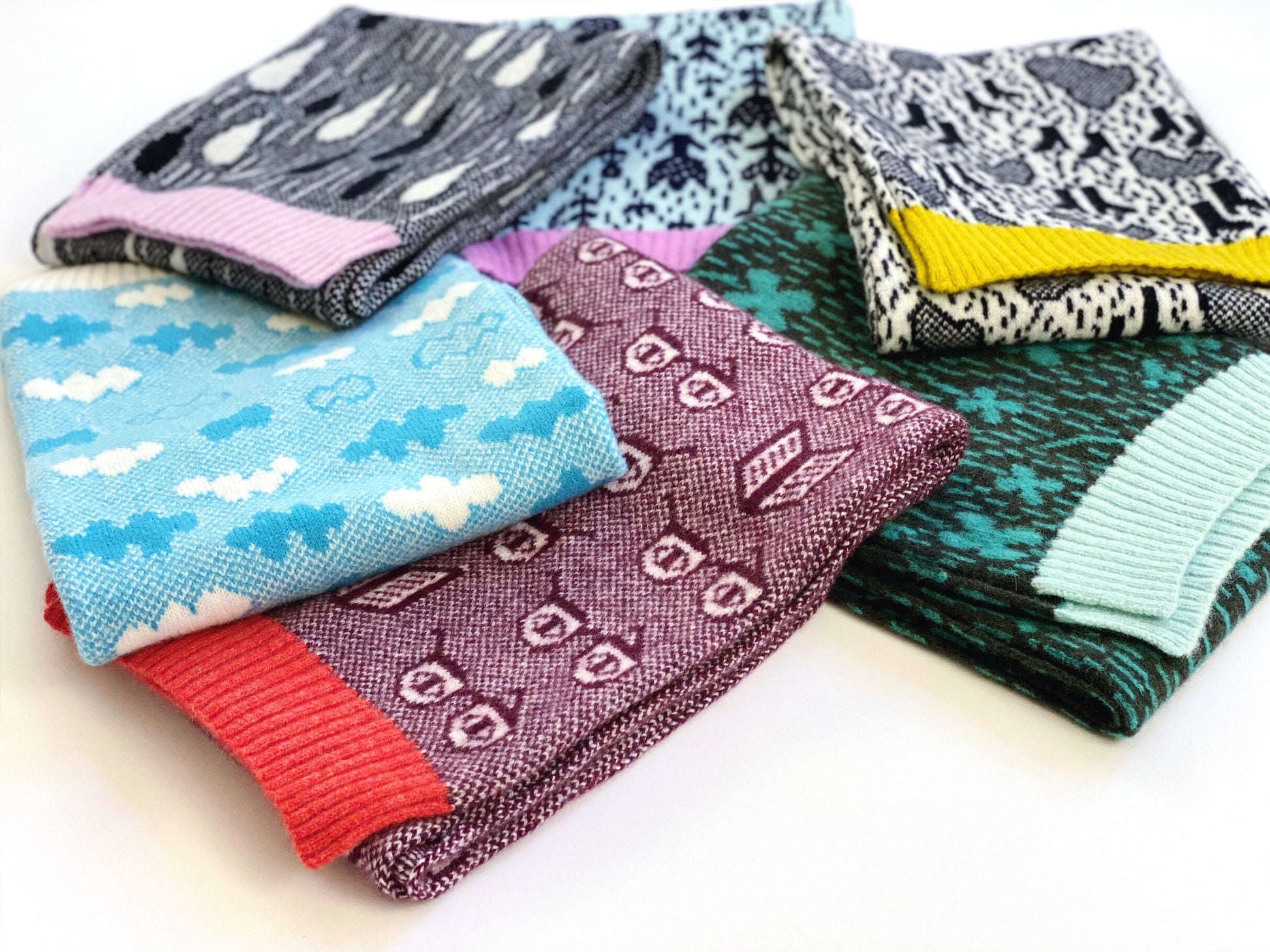Each scarf is designed and lovingly handmade by me using a domestic knitting machine and sewn by hand in my studio in the U.S.